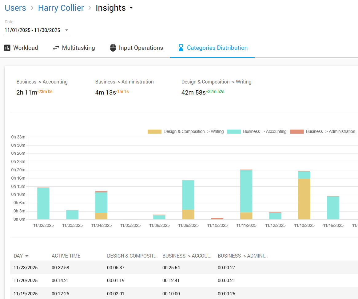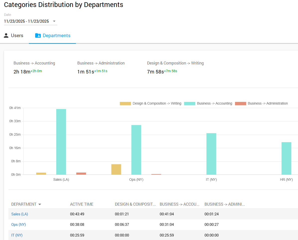 Receive an objective comparison across individual employees, or entire departments based on the activity categories they engage in to learn more about their roles demands.