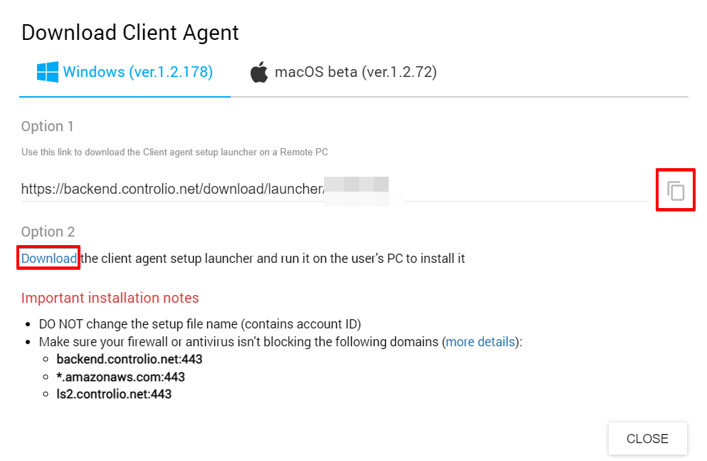 Depending on the operating system of the user’s PC, select the corresponding tab (Windows/macOS). You may download the Client Launcher app or copy & send the download link to your users (the download link will work directly, without necessarily having to access the dashboard). Please do not edit the Client Launcher file’s name as it contains your account id.