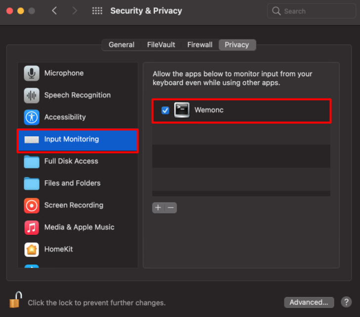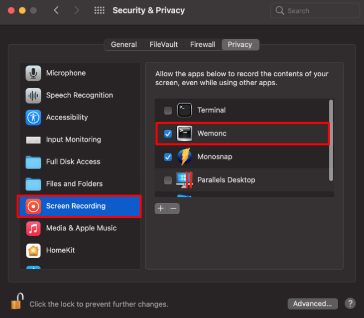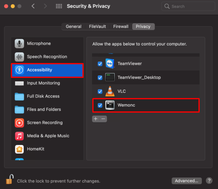 To ensure that the Client tracking functions are up and running, go to Security & Privacy and make sure that the checkbox next to Wemonc is checked for the following: