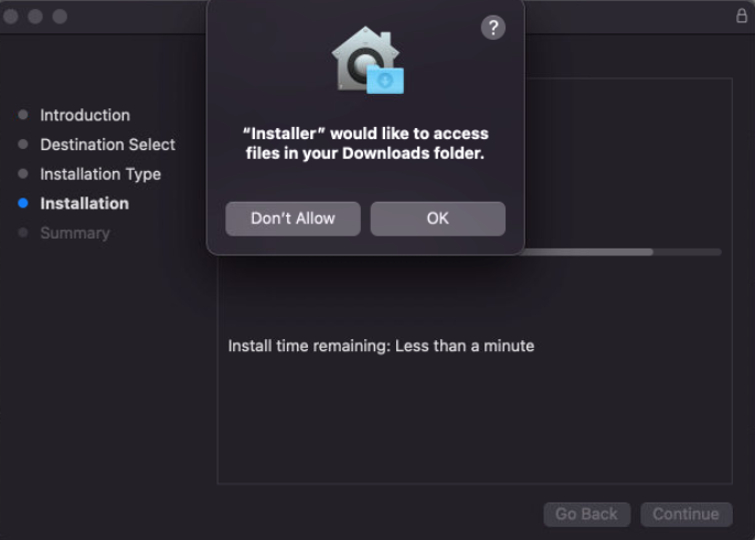 - If the installer would like to access files in your Downloads folder, please select OK.