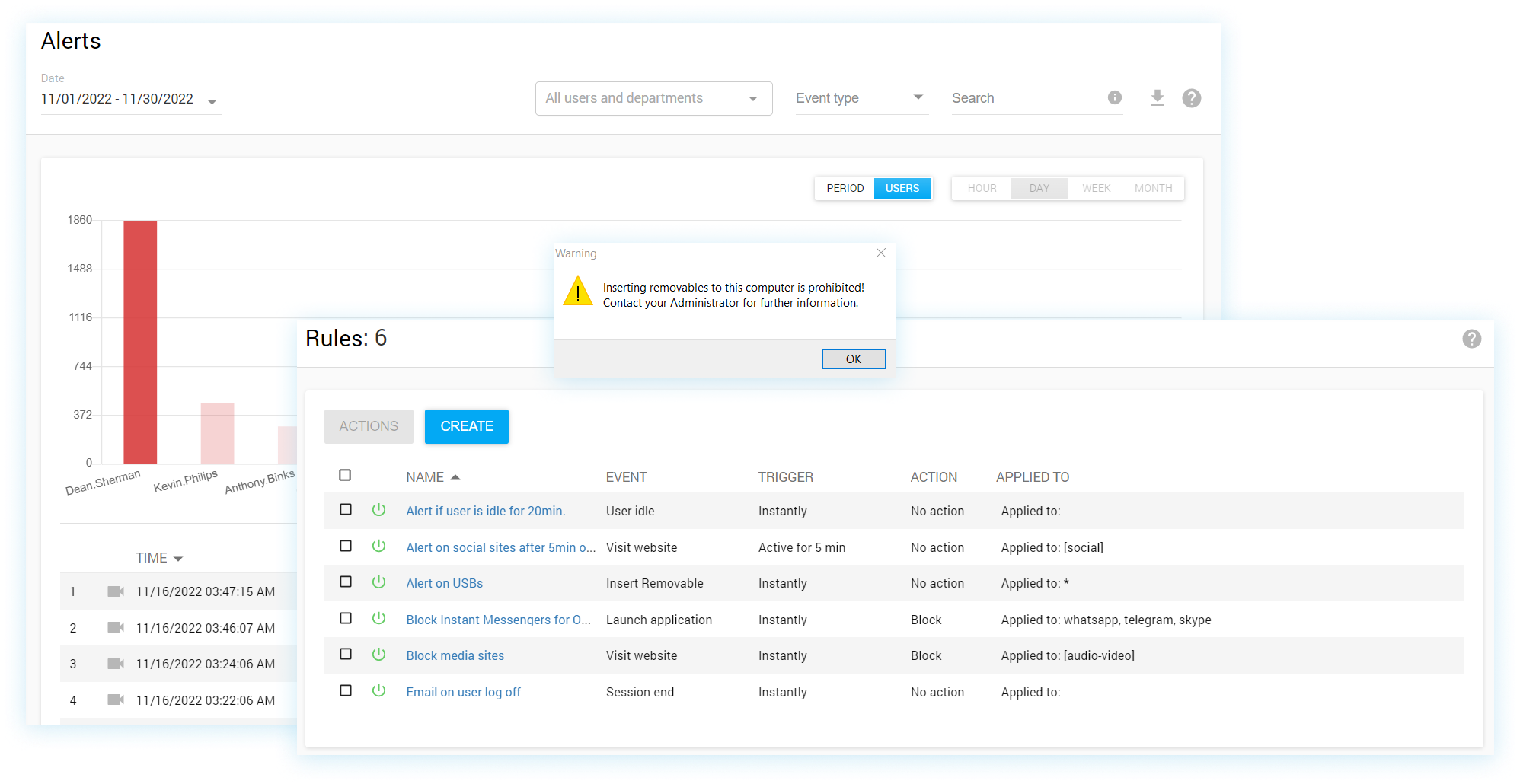 Detect employee misconduct, protect sensitive data, and remove productivity obstacles by setting up alerts notifying supervisors of workplace morale violations. Controlio allows you to construct flexible rules for the entire company, various departments, or individual employees providing you with alerts on accessing distracting websites/applications , excessive idle time, the use of portable media, and other actions.