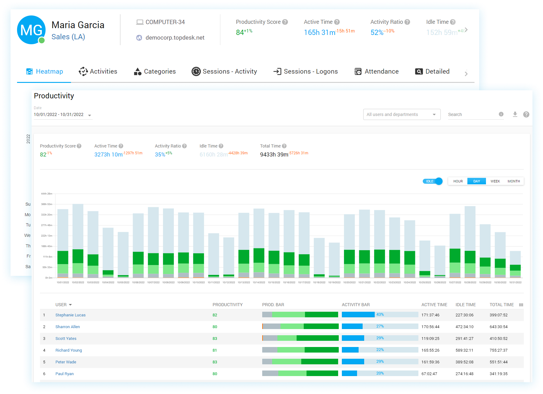 - Getting insight into employee engagement — reports on active time spent performing tasks. Controlio reveals whether your team members really interact with their computers during working hours and delivers the Activity Ratio metric to gauge their engagement.
