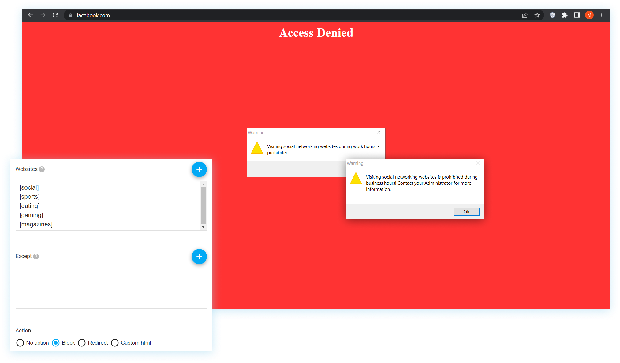 Moreover, Controlio falls into the most advanced category of this type of software, which provides hands-on tools for decreasing security risks and removing productivity obstacles. These tools include blocking and redirecting features along with alerts and warnings, which can be configured with surgical accuracy to target individual users or separate teams.