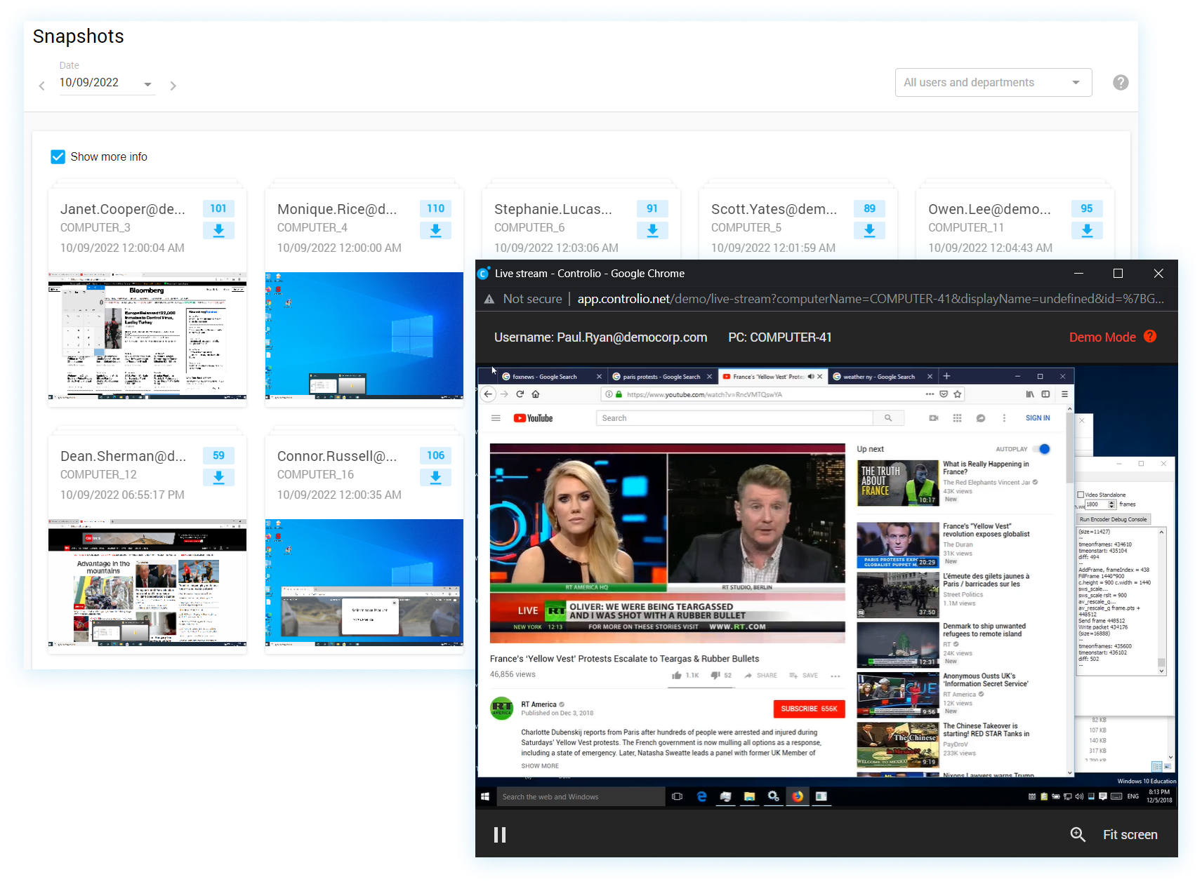 The screen-capturing opportunities of tracking software range from simple screenshots to full-scale live streaming. Controlio products, for example, can take a shot of computer screens every five minutes when a user is active, record full MPEG-4 video pieces, and stream screen recordings in real time. These captures are useful in many ways: