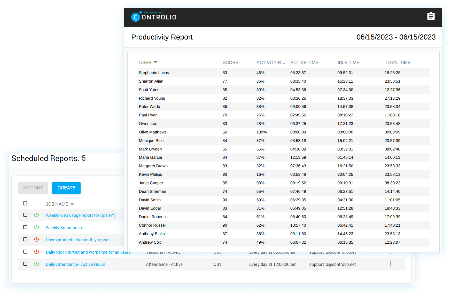 Get the most out of data-packed reports by directing relevant information to the right hands at the right time. You decide which pieces of data to include, how often the reports are generated, who they are addressed to, and what is the preferable document format, while Controlio ensures accurate data collection and fail-safe delivery via email.