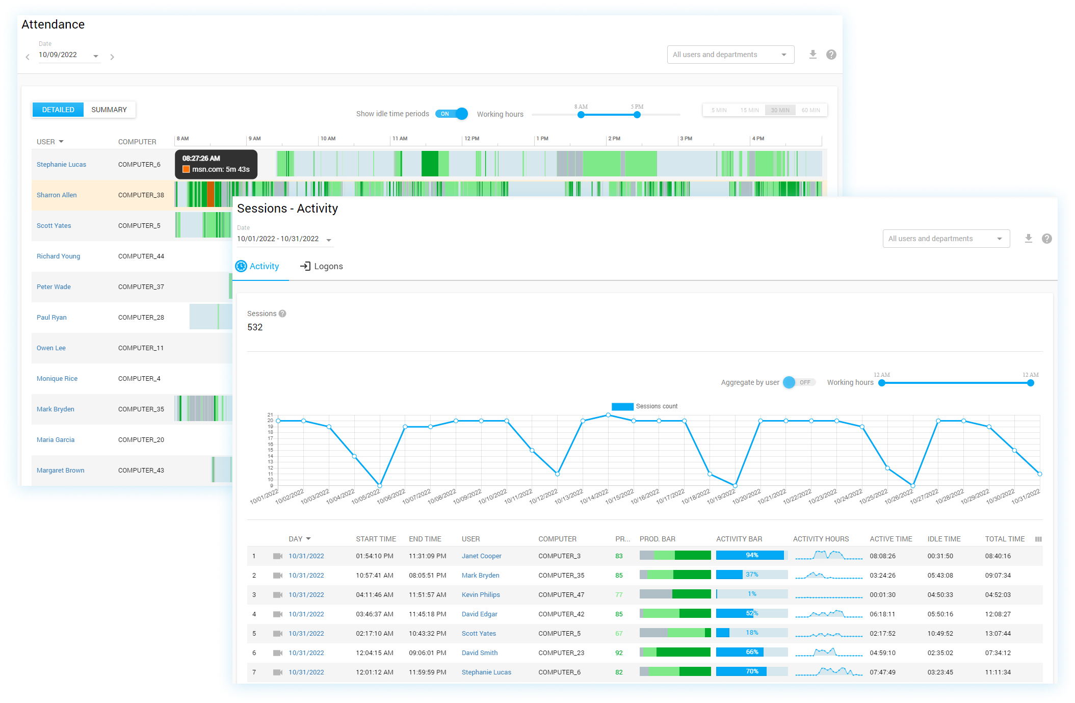 Usually, employee monitoring software records total, active, and idle times spent by users performing various computer activities based on their interaction with the mouse and keyboard. These data serve to evaluate employee engagement, track breaks, spot workplace absence and distractions, or calculate billable hours spent in work apps. Some solutions offer manual clock in/out, while others automatically record the start and end of working sessions. Controlio products provide even two options: the logon/logoff time of user sessions and the start/end of their computer activities.