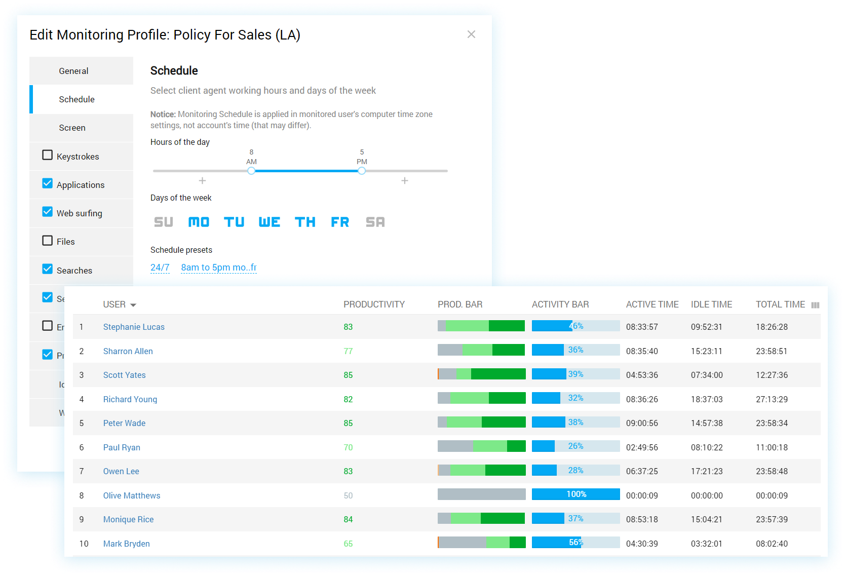 Spot which computer-based activities consume your employees’ work hours the most and learn whether or not these activities correspond to their job duties. Having visibility into which apps and websites are being used by your staff will help identify work discipline violations, useless tools clogging your inventory, and even gaps in security enabling you to develop appropriate measures and put an end to the waste of time and resources.