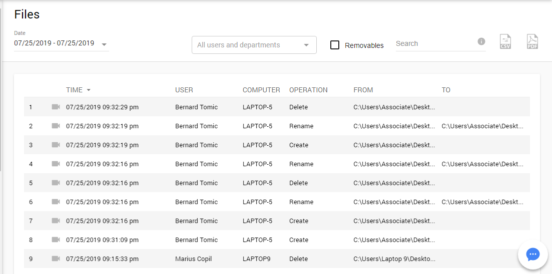 Controlio understands these concerns. The Files report will show you all the file actions taken by team members on every computer they access. You will know exactly who created, renamed, copied, or deleted a file.
