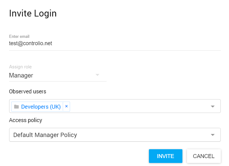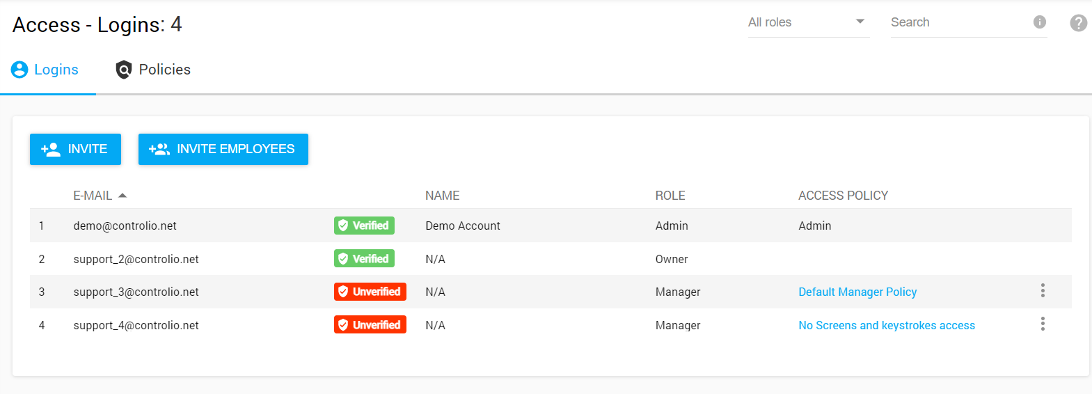 This section enables managing verified users (logins) who have access to the Controlio dashboard as well as configuring policy rules to control which data can be accessed by them.