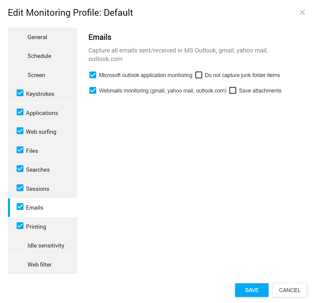 This feature captures all the emails sent or received using the Microsoft Outlook application and webmails (Gmail, Yahoo mail, Outlook.com).