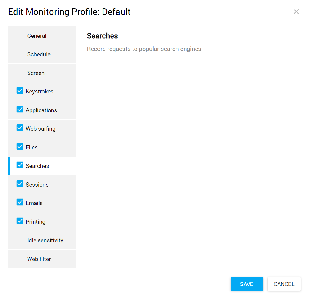 Searches monitoring logs all keywords that are being looked up by employees on the most famous search engines (e.g. Google, Bing, Yahoo, etc.)