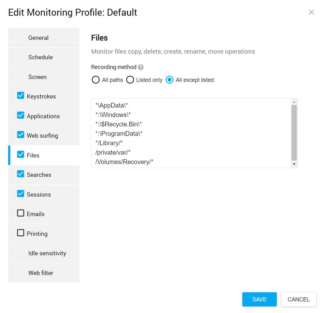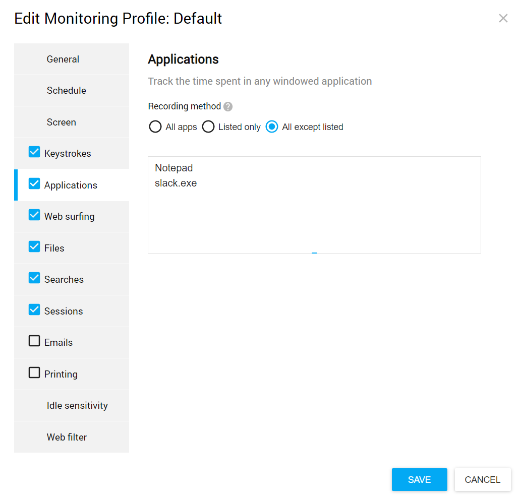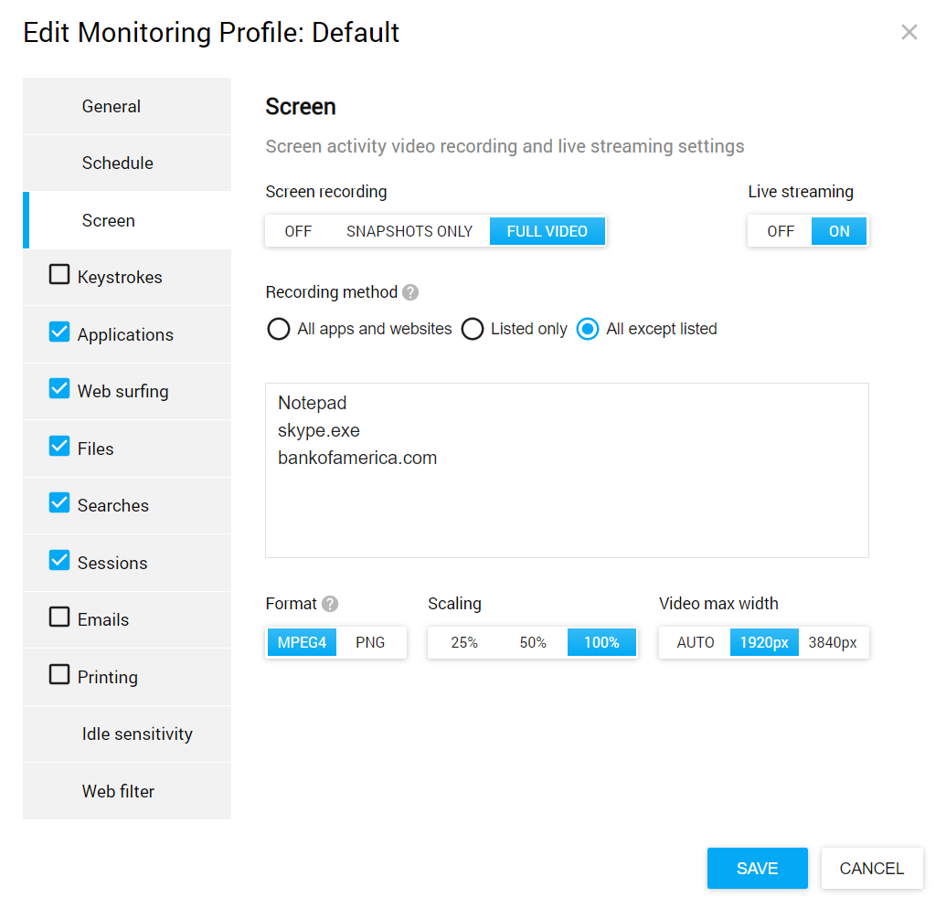 The Recording Method can be used for further customization of monitoring profiles, for example, you can choose to capture the screen on All apps and websites, or choose the option Listed only or All except listed. This list will enable or disable screen recording depending on which apps and websites are running on the foreground. For example, you may exempt banking websites and apps from being captured. The filtering list supports apps names or extensions, and domains names or masks: