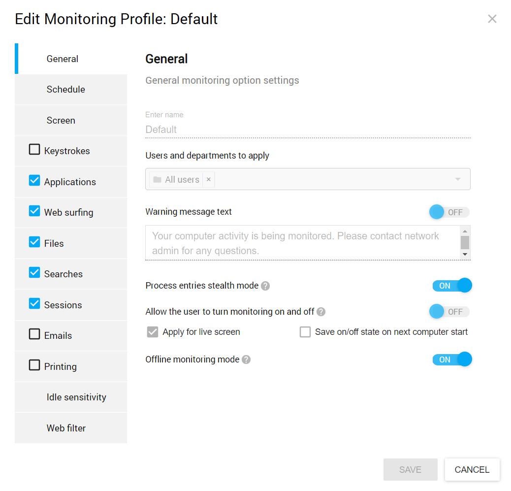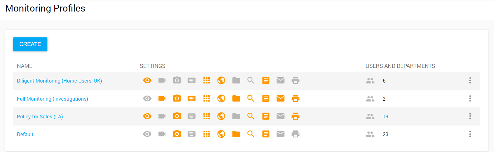 Monitoring profiles grant you the ability to control which type of information will be collected precisely. You may create as many monitoring profiles as needed and assign each of them to a specific group of users or departments. For example, you may enable screen monitoring for a group of employees and have them monitored from 8 AM to 5 PM; on the other hand, you can disable screen monitoring for another group of employees and have them monitored at all times.
