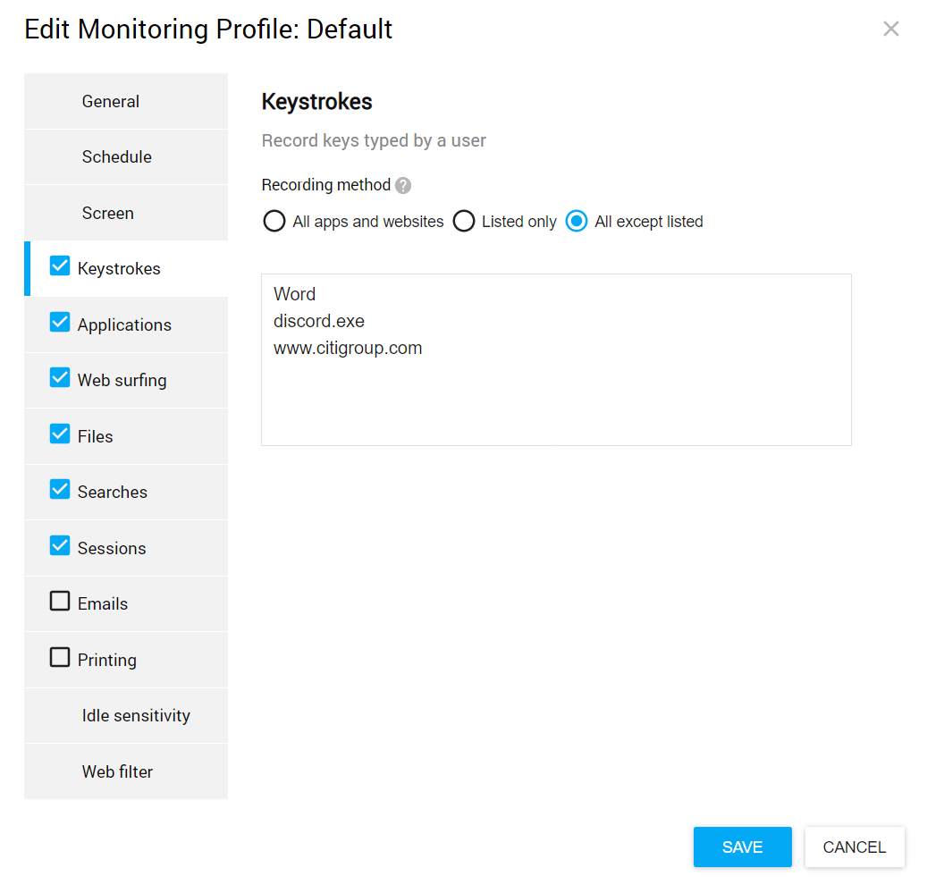 The Recording Method can be used for further customization of monitoring profiles, for example, you can choose to capture the screen on All apps and websites, or choose the option Listed only or All except listed. This list will enable or disable keystrokes tracking depending on which apps and websites are running on the foreground. For example, you may exempt banking websites and apps from being captured. The filtering list supports apps names or extensions, and domains names or masks: