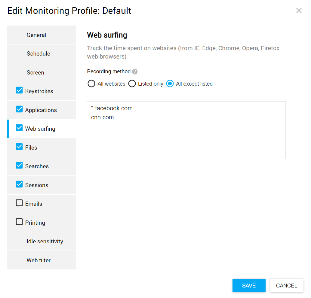 The Recording Method can be used for further customization of monitoring profiles, for example, you can choose to track time on All websites, or choose the option Listed only or All except listed. This list will enable or disable time tracking depending on which website is being engaged on the foreground. The filtering list supports domains names and masks: