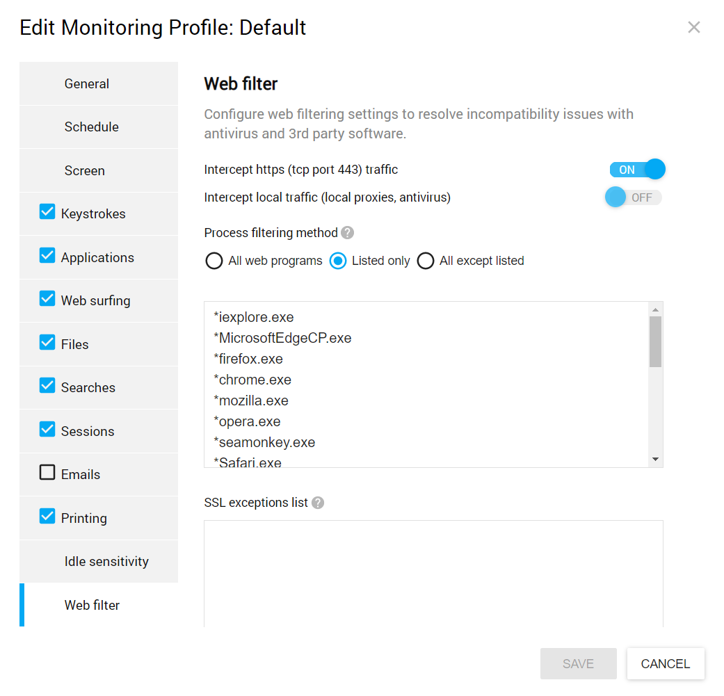 From this section of the monitoring profile settings, you can control which traffic is intercepted by the web filtering driver, and on which web browsers or websites do the web filtering settings apply.