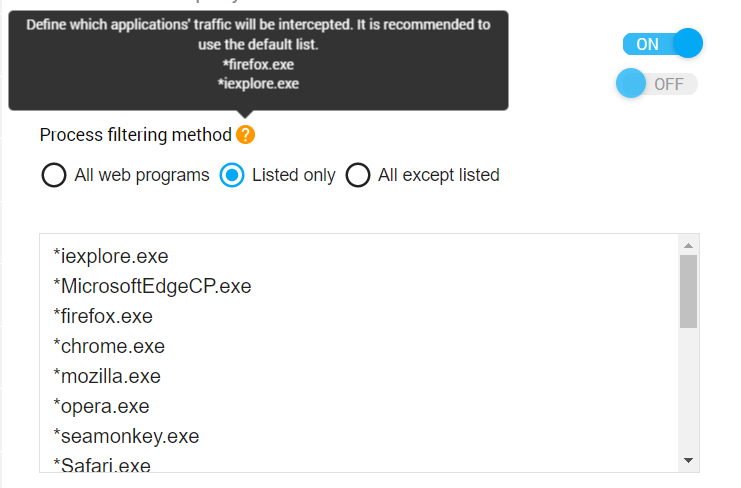With the help of the process filtering method, you can specify which web applications’ traffic will be intercepted by the web filter. If you keep the default settings, the most famous web applications’ traffic will be intercepted, but you are welcome to adjust that to match your needs.