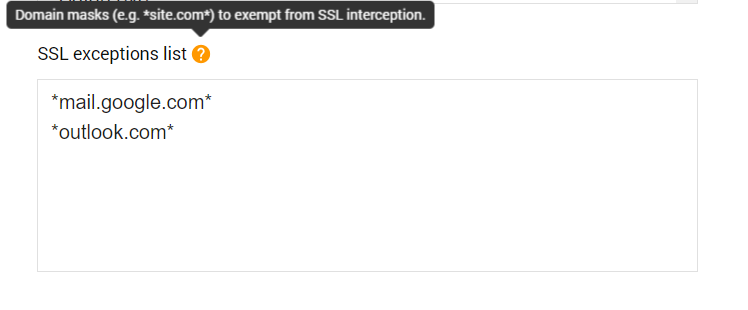 Moreover, you may exclude the traffic interception of specific websites by listing them in the SSL exceptions list.