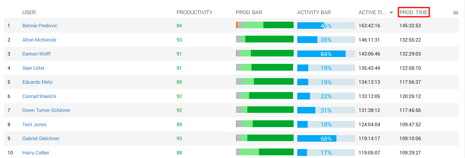 Another way to measure employee productivity is by using the Productive Time metric (Prod. Time).