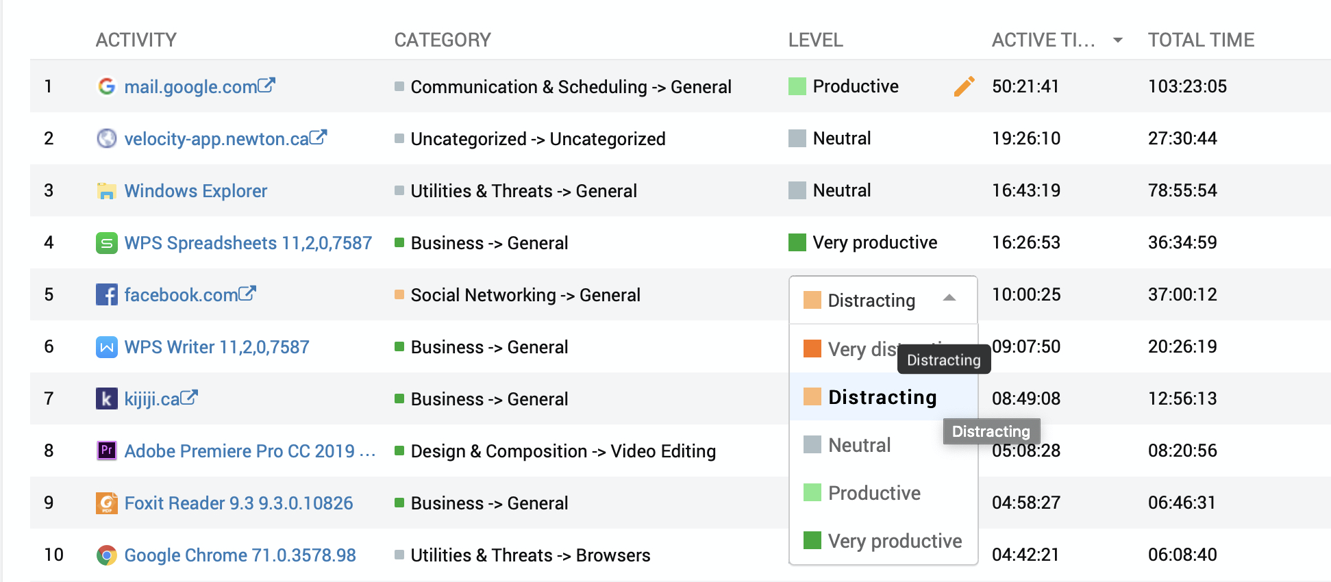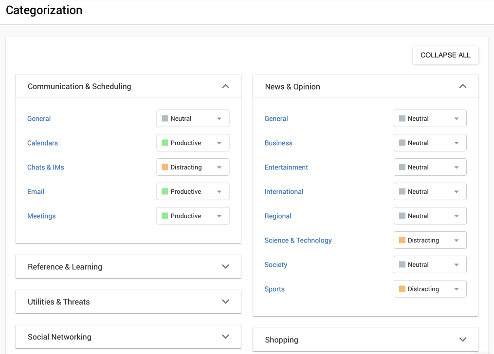 Note: you may set up custom productivity level settings for applications/websites per users or per departments.
