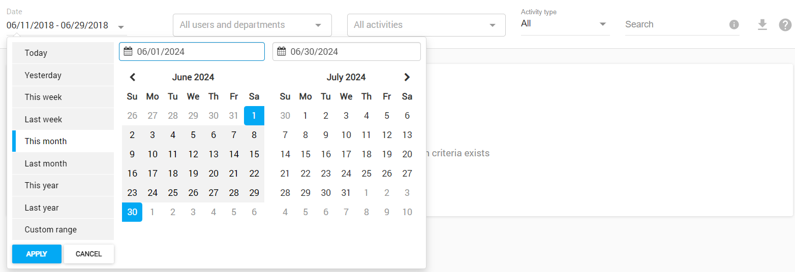 - Activity type selector: Choose precisely which type of activity (applications or websites) you want to review, or select All to remove the filter.