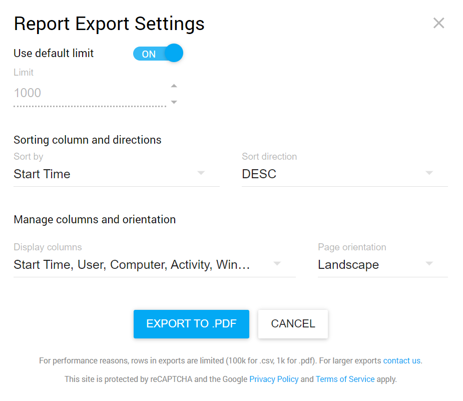 If you select the PDF option, a popup with various settings will appear where you can limit the number of lines that will be exported, select by which parameter will the extracted information be sorted as well as the direction of the sorting, manage the columns that will appear in the exported document, and choose its orientation.