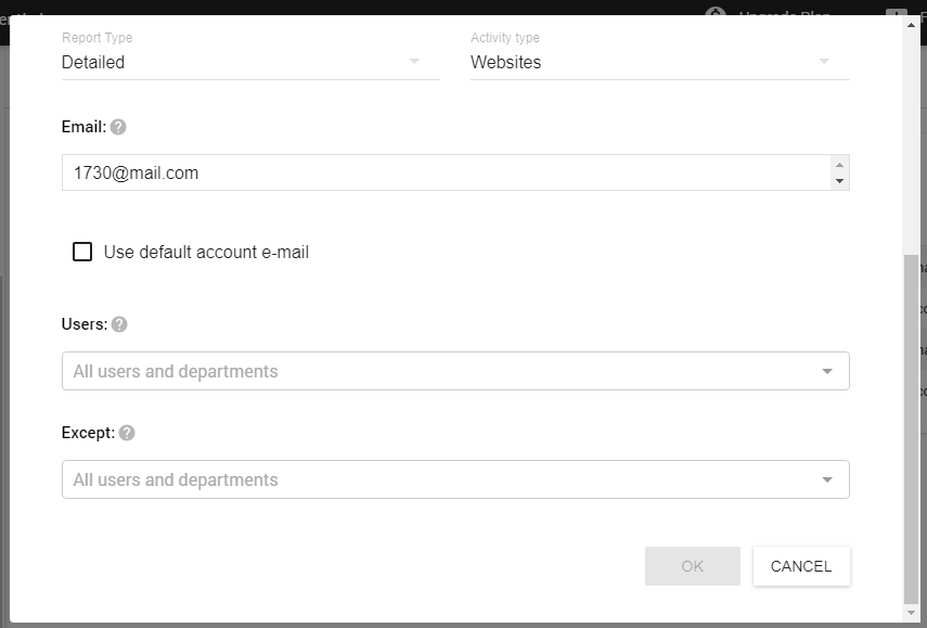 If no one is selected as the Users or Exceptions, the report data will be generated for All Users in the account. You can specify any email recipient of the report, or use the default email login system (so, the report will be sent to the e-mail of the user, who is logged to the web console right now).