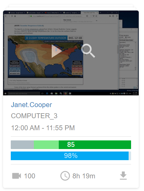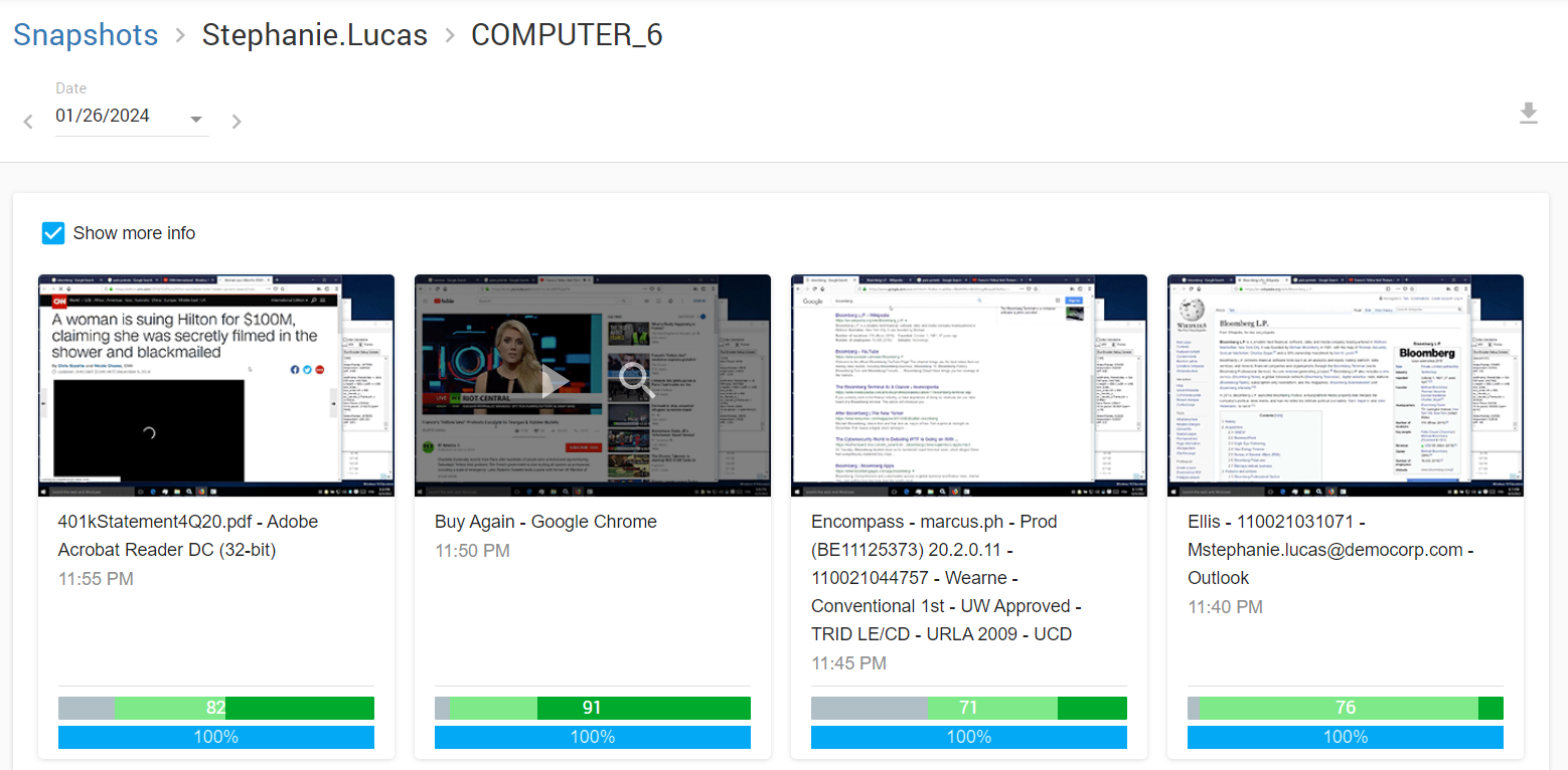 Snapshots are quick previews of the screen recording that are taken with a periodicity of 5 minutes typically used to help you visually navigate your way throughout work hours to detect any abnormalities. A snapshot folder will be available for each user on each day with a brief productivity summary.