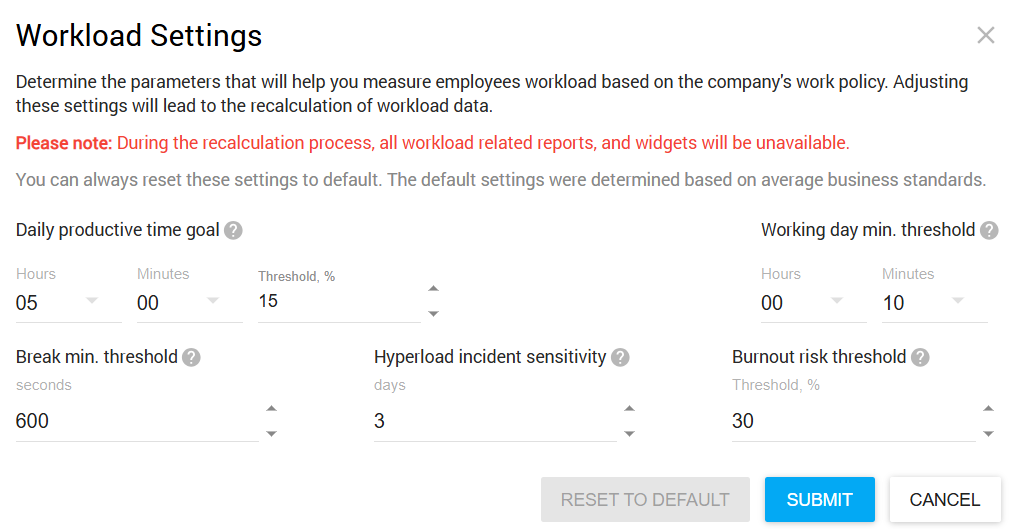 The workload is determined using the goal specified in the Workload Settings (By default ~5 hours of productive time). Employees with fewer productive hours than this threshold are viewed as underloaded, while those within the target range are considered balanced. If their productive hours surpass the threshold, it suggests they are overloaded or potentially at risk of burnout.