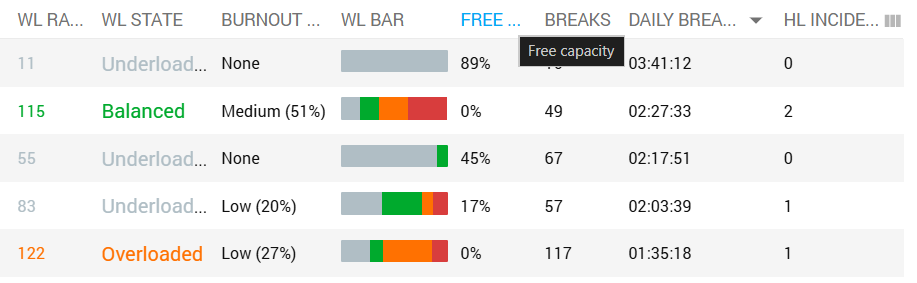 Get a high level summary of employees average productive time, number of breaks, and average break duration. Find out how many of your employees are underloaded, overloaded, maintaining a balanced workload, or at risk of burnout.